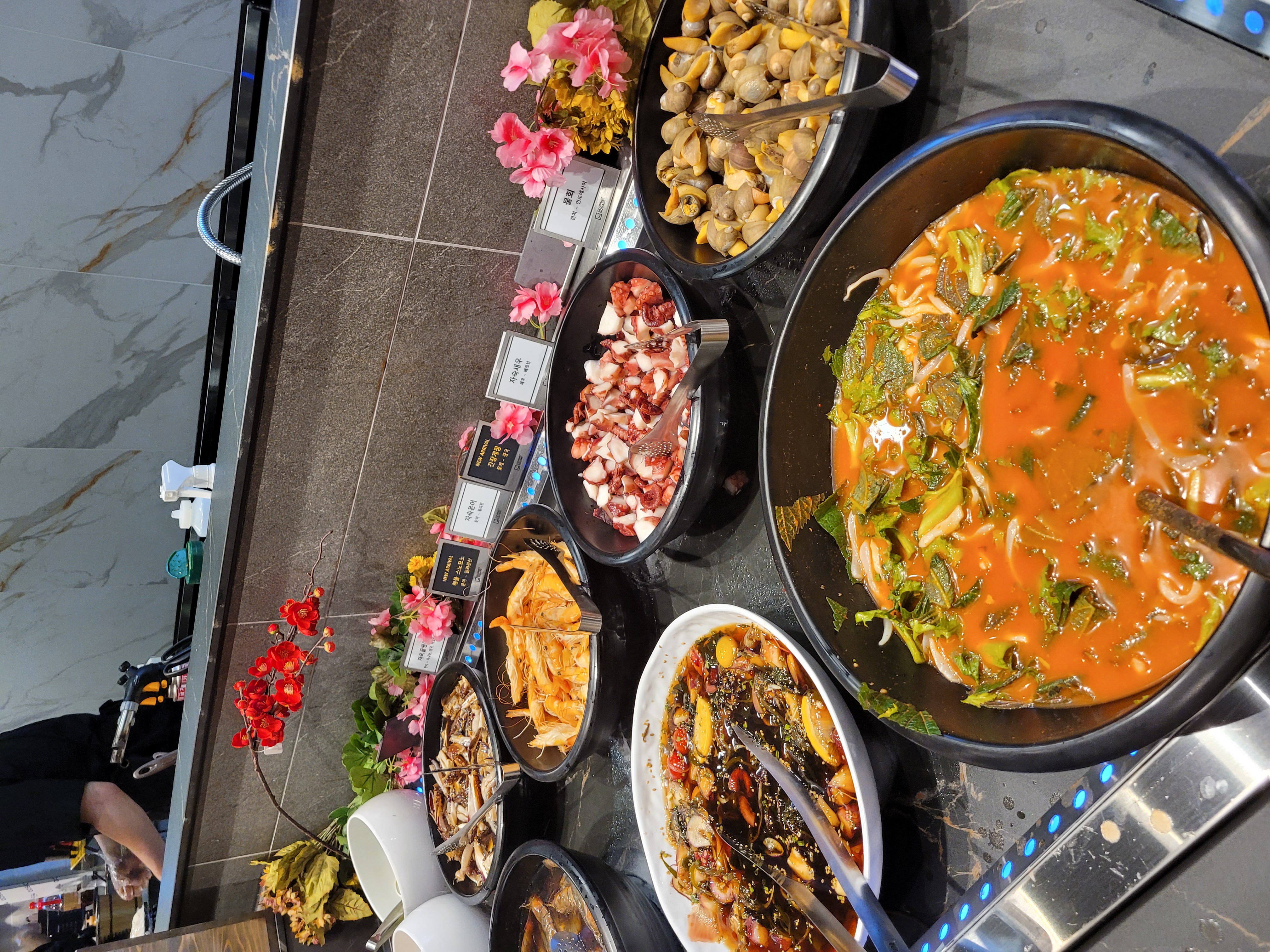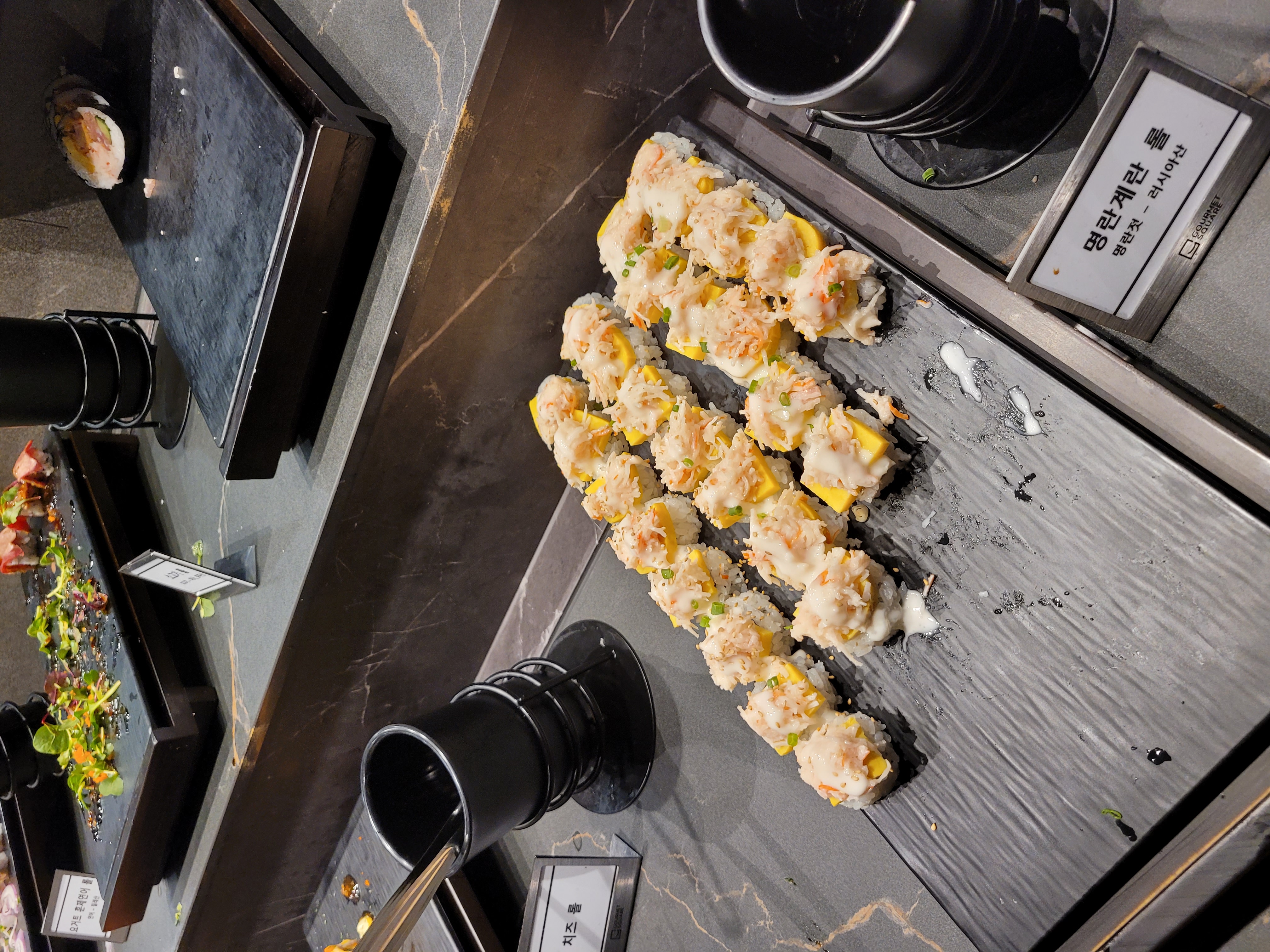 일부 시간대에는 인파가 몰려 리필이 늦어질 수 있지만, 전체적으로는 리필이 자주 돌아가는 편입니다. 가장 인기 있는 메뉴(연어 초밥, 새우장, 간장게장 등)는 사람이 붐비지 않을 때 먼저 가져오는 것이 좋습니다.