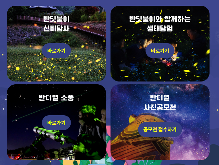 그리고 축제 기간외에 운영되는 숙박을 연계한 반딧불이와 함께하는 생태탐험 등도 있으니 참여를 원하시는 분들은 위의 버튼이나 아래 버튼을 통해 참여하세요.